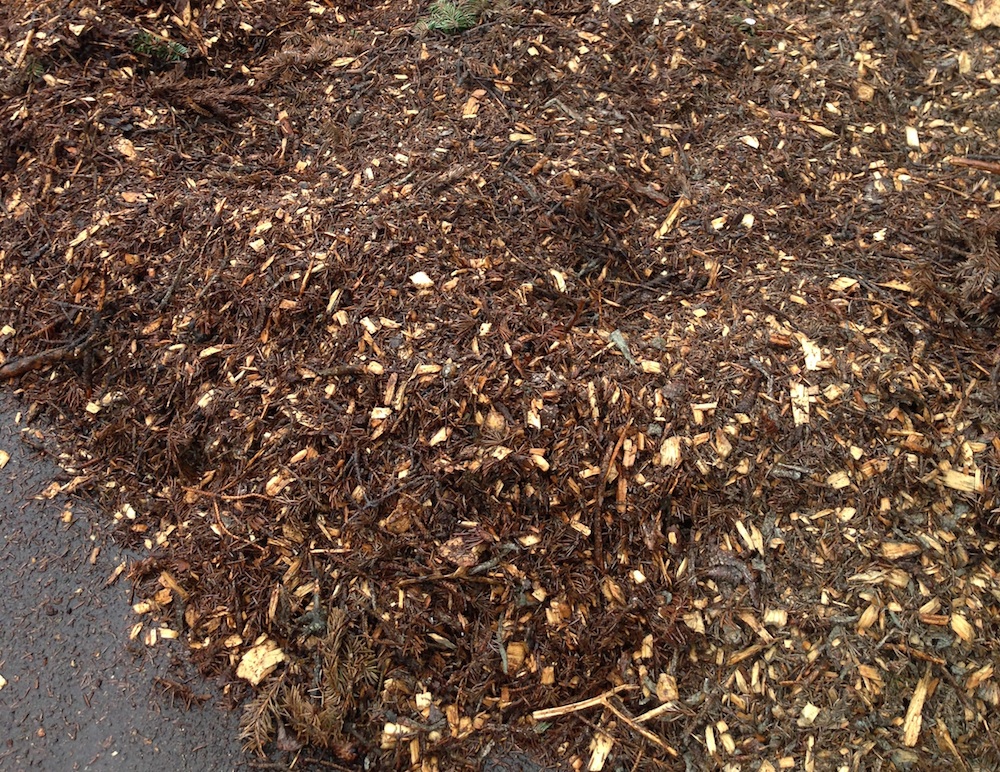A typical load contains about 50% wood chips and 50% green, leafy material or pine needles. About 5% of the load is often unchipped brush, small sticks, and maybe a few scoops of dirt, gravel or trash.
